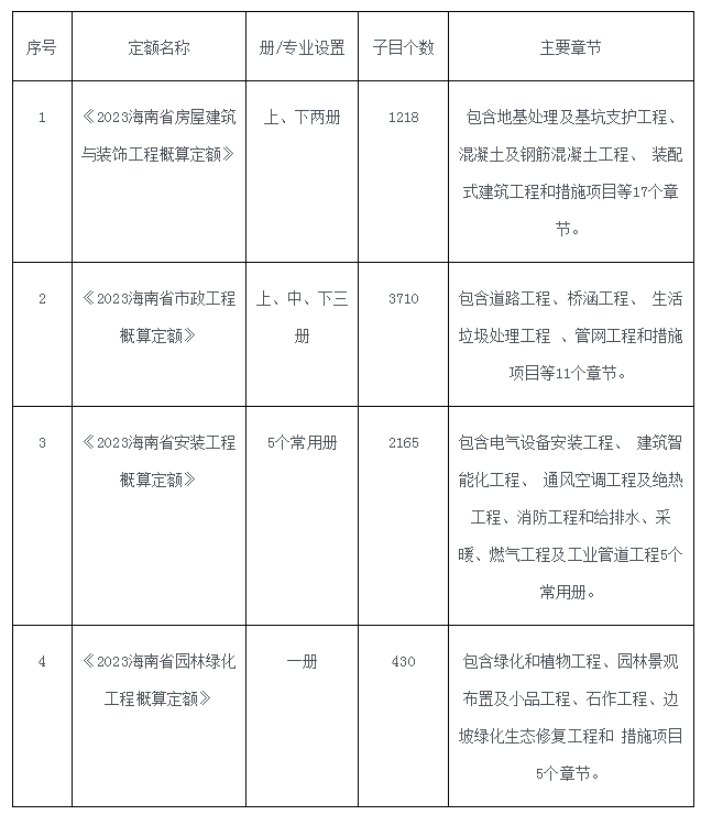 为进一步完善我省计价依据体系,满足《海南省政府投资项目管理办法》关于初步设计与概算的编制需要,我厅组织编写了《海南省建设项目总概算组成及其他费用计算规定》,以及《2023海南省房屋建筑与装饰工程概算定额》、《2023海南省市政工程概算定额》、《2023海南省安装工程概算定额》和《2023海南省园林绿化工程概算定额》等四部专业概算定额(以下简称“一个规定+四个专业概算定额”),供社会各界使用参考。