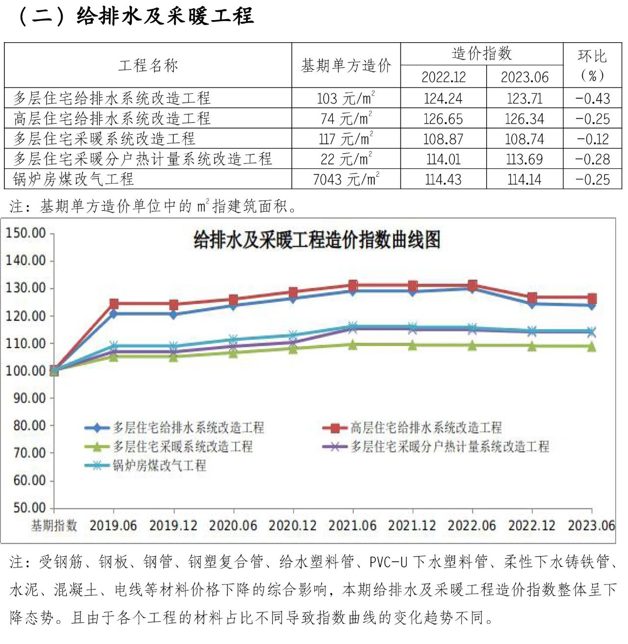 为贯彻落实《关于全面推进城镇老旧小区改造工作的指导意见》(国办发〔2020〕23号)要求,加强对老旧小区整治工程造价的动态指导,为合理确定和有效控制工程造价提供参考,现发布第十二期北京市老旧小区综合改造工程造价指数。本指数在《北京市老旧小区综合改造技术经济指标》(2017)的基础上进行测算,以2016年9月为基期,2017年12月为第一期,之后每半年发布一次。2016年9月的基期造价指数为100,本期人工、材料、机械等价格按2023年6月的《北京工程造价信息》(房屋修缮工程)确定,未包括的材料价格参照同期市场价。