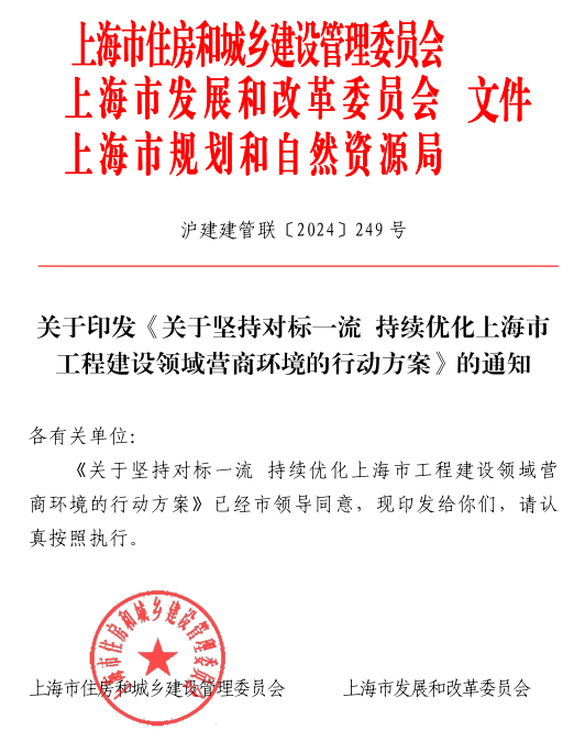 6月18日,上海市住建委印发《关于坚持对标一流持续优化上海市工程建设领域营商环境的行动方案》。