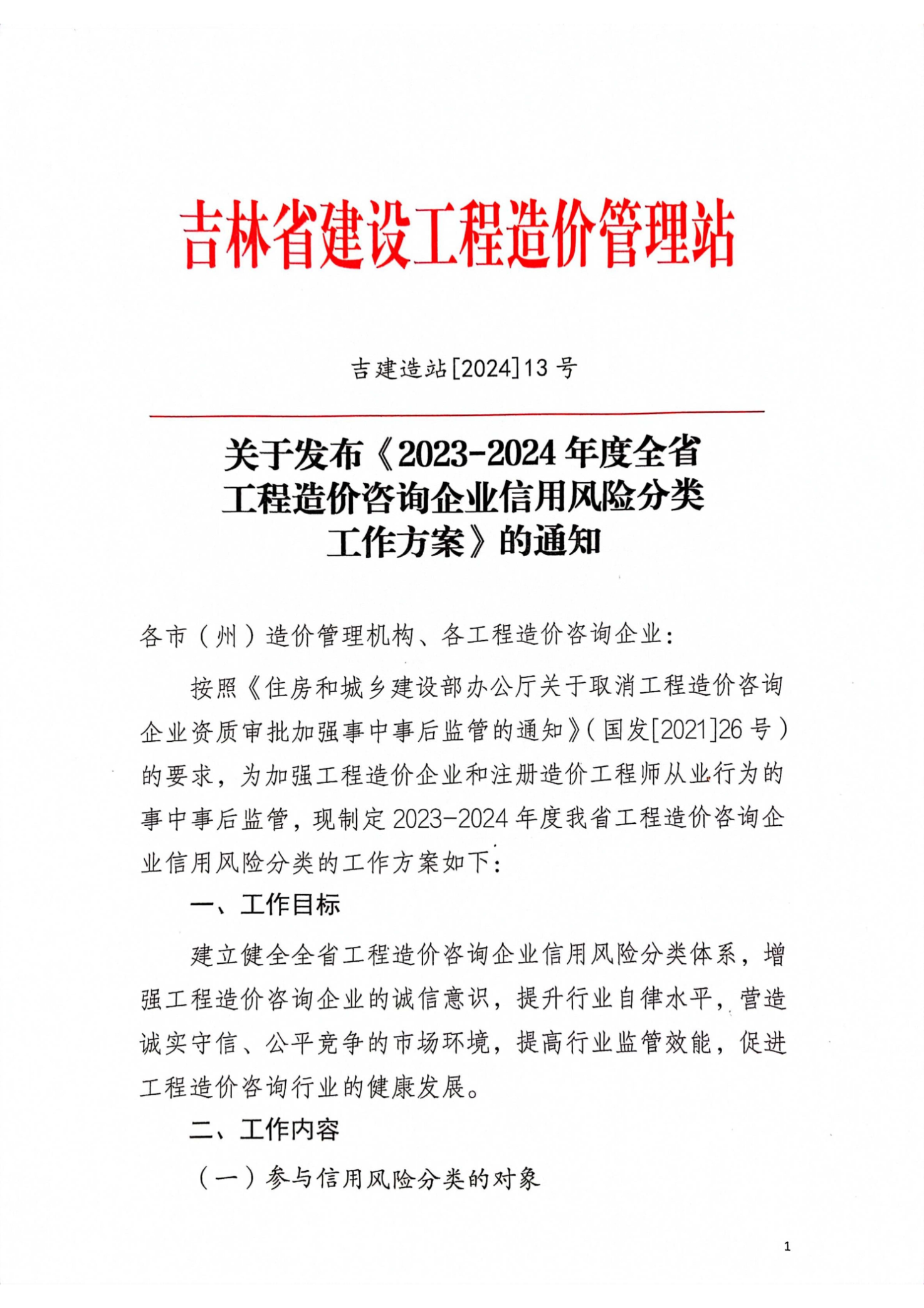 吉林省建设工程造价管理站关于发布《2023-2024年度全省工程造价咨询企业信用风险分类工作方案》的通知