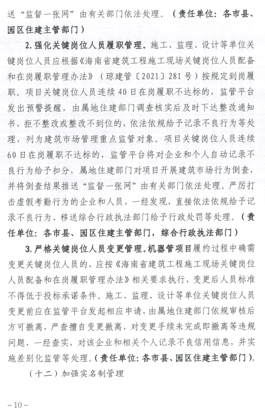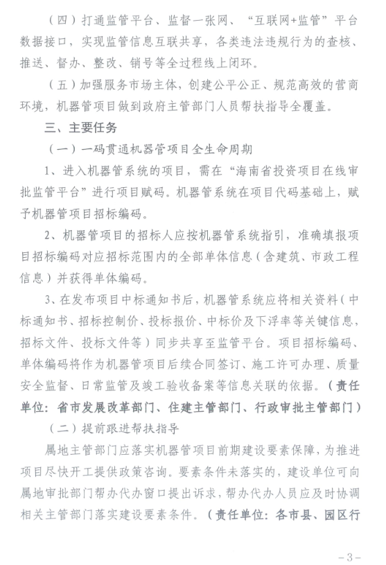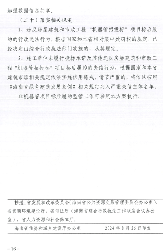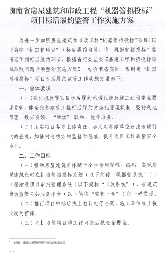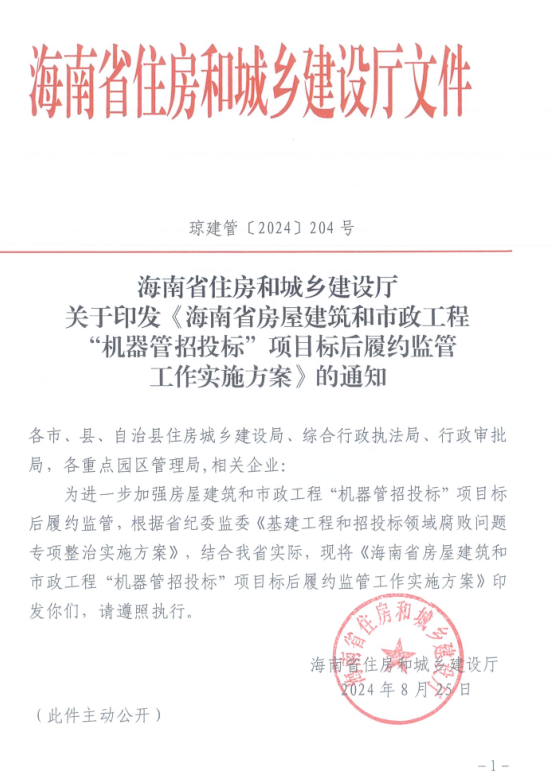海南省住房和城乡建设厅关于印发《海南省房屋建筑和市政工程“机器管招投标”项目标后履约监管工作实施方案》的通知