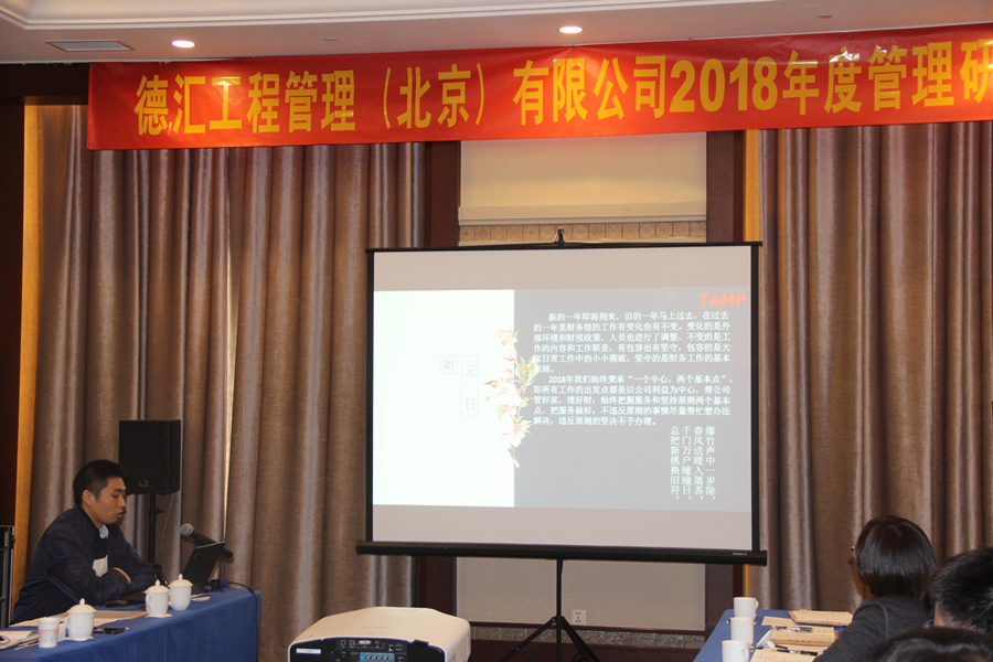 2019年1月26日,德汇工程管理(北京)有限公司在龙熙温泉酒店召开了2018年度管理研讨会。会议由副总经理谭挺主持,公司管理层共21人参加本次会议。